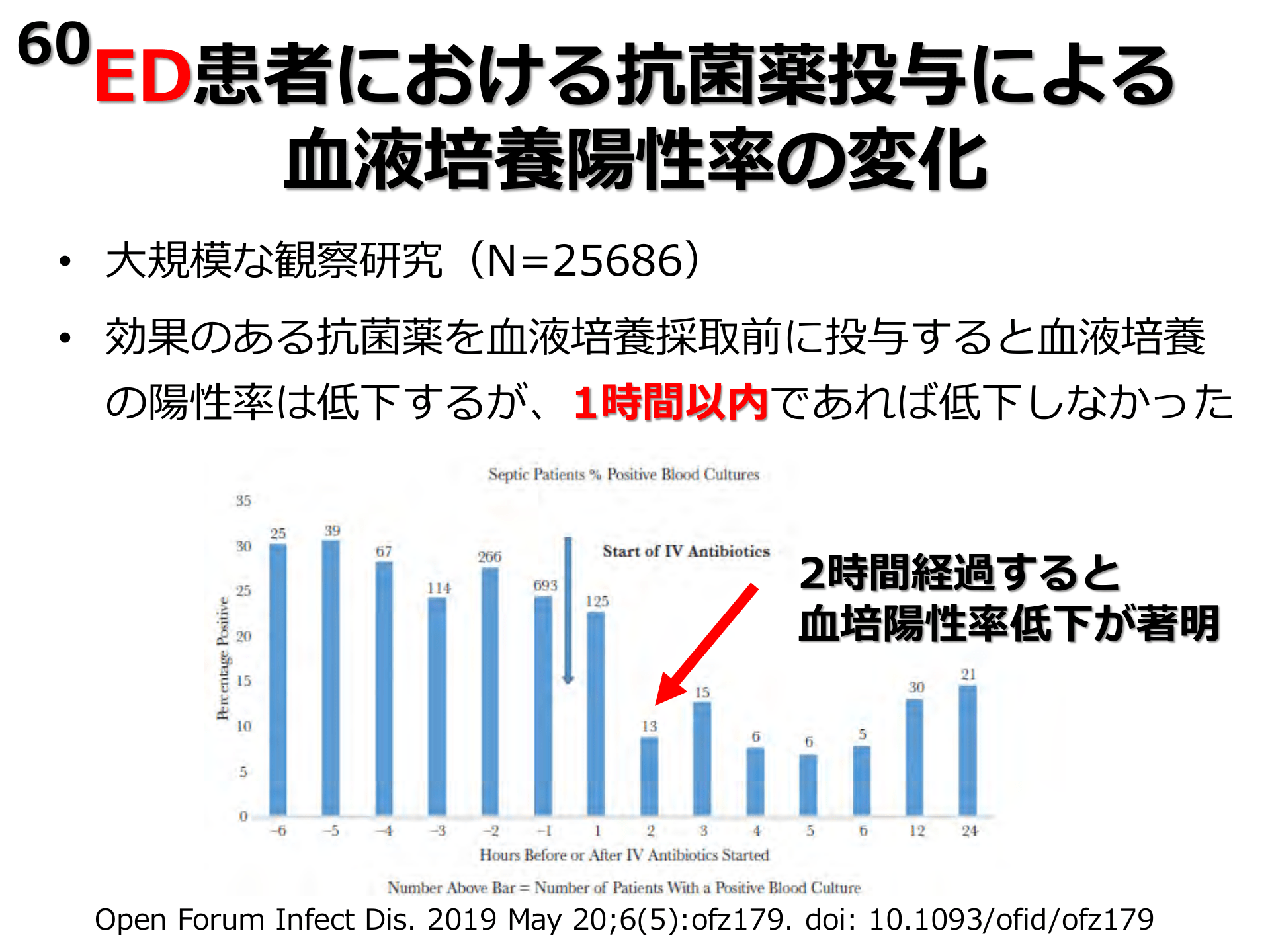 #78. 60 ED患者における抗菌薬投与による 血液培養陽性率の変化 • 大規模な観察研究(N=25686) • 効果のある抗菌薬を血液培養採取前に投与すると血液培養 の陽性率は低下するが、1時間以内であれば低下しなかった 2時間経過すると 血培陽性率低下が著明 Open Forum Infect Dis. 2019 May 20;6(5):ofz179. doi: 10.1093/ofid/ofz179