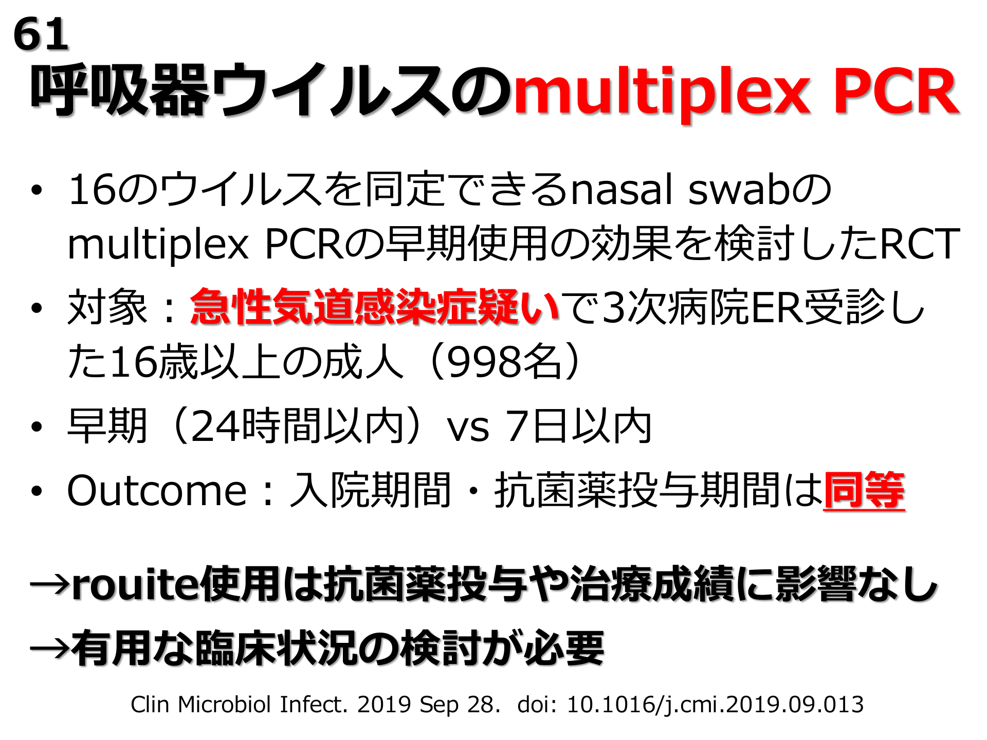 #79. 61 呼吸器ウイルスのmultiplex PCR • 16のウイルスを同定できるnasal swabの multiplex PCRの早期使用の効果を検討したRCT • 対象:急性気道感染症疑いで3次病院ER受診し た16歳以上の成人(998名) • 早期(24時間以内)vs 7日以内 • Outcome:入院期間・抗菌薬投与期間は同等 →rouite使用は抗菌薬投与や治療成績に影響なし →有用な臨床状況の検討が必要 Clin Microbiol Infect. 2019 Sep 28. doi: 10.1016/j.cmi.2019.09.013