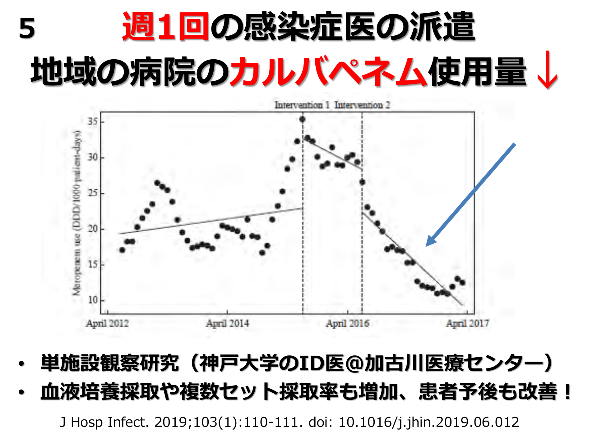 #8. 週1回の感染症医の派遣 地域の病院のカルバペネム使用量↓ 5 • 単施設観察研究(神戸大学のID医@加古川医療センター) • 血液培養採取や複数セット採取率も増加、患者予後も改善! J Hosp Infect. 2019;103(1):110-111. doi: 10.1016/j.jhin.2019.06.012