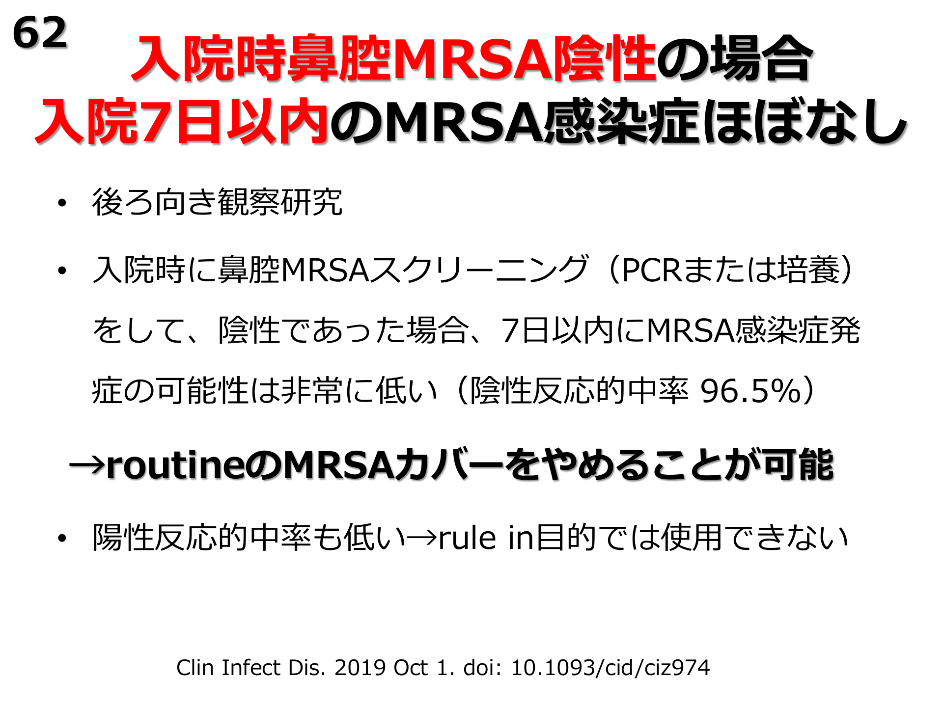 #80. 62 入院時鼻腔MRSA陰性の場合 入院7日以内のMRSA感染症ほぼなし • 後ろ向き観察研究 • 入院時に鼻腔MRSAスクリーニング(PCRまたは培養) をして、陰性であった場合、7日以内にMRSA感染症発 症の可能性は非常に低い(陰性反応的中率 96.5%) →routineのMRSAカバーをやめることが可能 • 陽性反応的中率も低い→rule in目的では使用できない Clin Infect Dis. 2019 Oct 1. doi: 10.1093/cid/ciz974