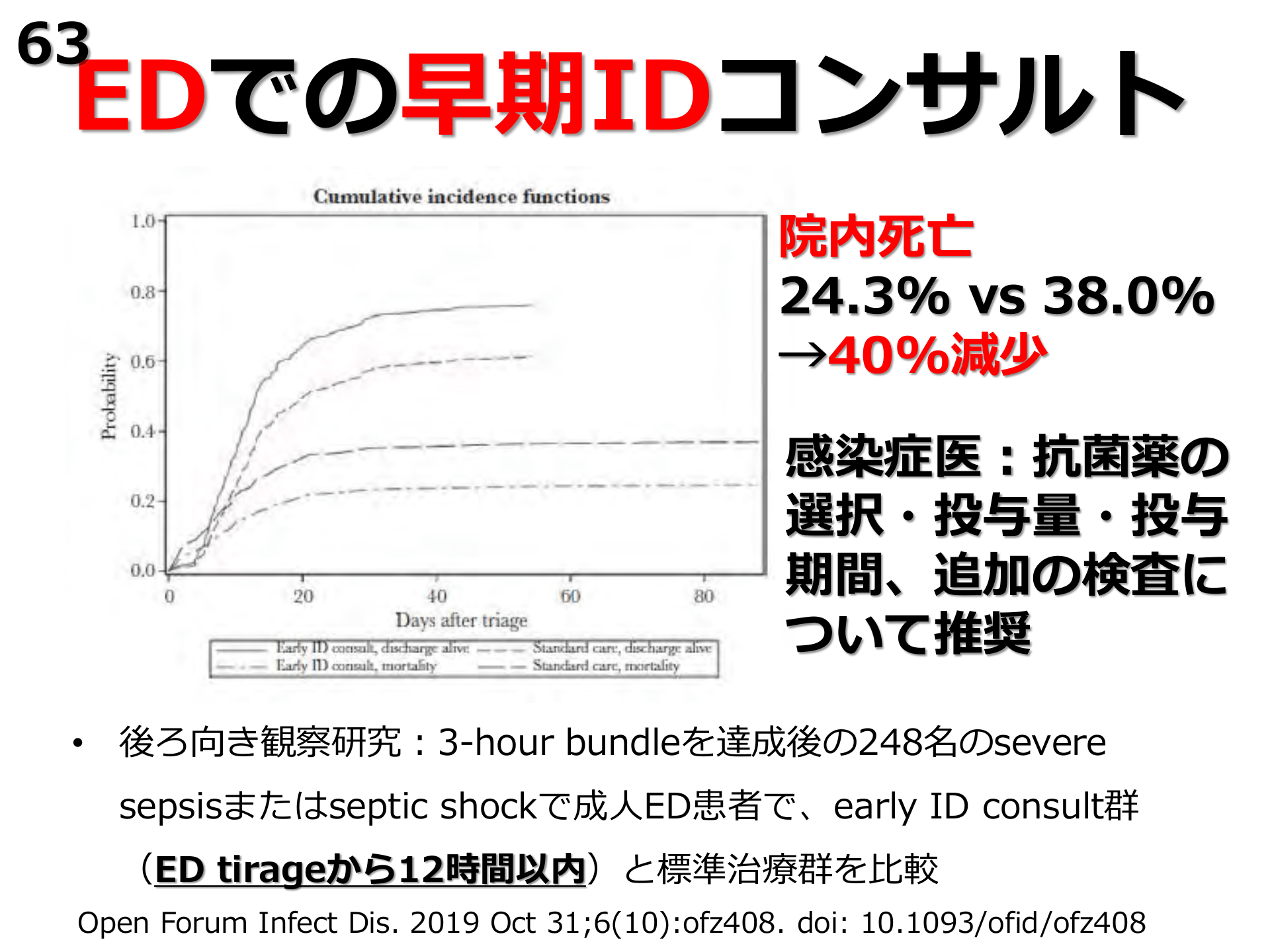 #82. 63 EDでの早期IDコンサルト 院内死亡 24.3% vs 38.0% →40%減少 感染症医:抗菌薬の 選択・投与量・投与 期間、追加の検査に ついて推奨 • 後ろ向き観察研究:3-hour bundleを達成後の248名のsevere sepsisまたはseptic shockで成人ED患者で、early ID consult群 (ED tirageから12時間以内)と標準治療群を比較 Open Forum Infect Dis. 2019 Oct 31;6(10):ofz408. doi: 10.1093/ofid/ofz408