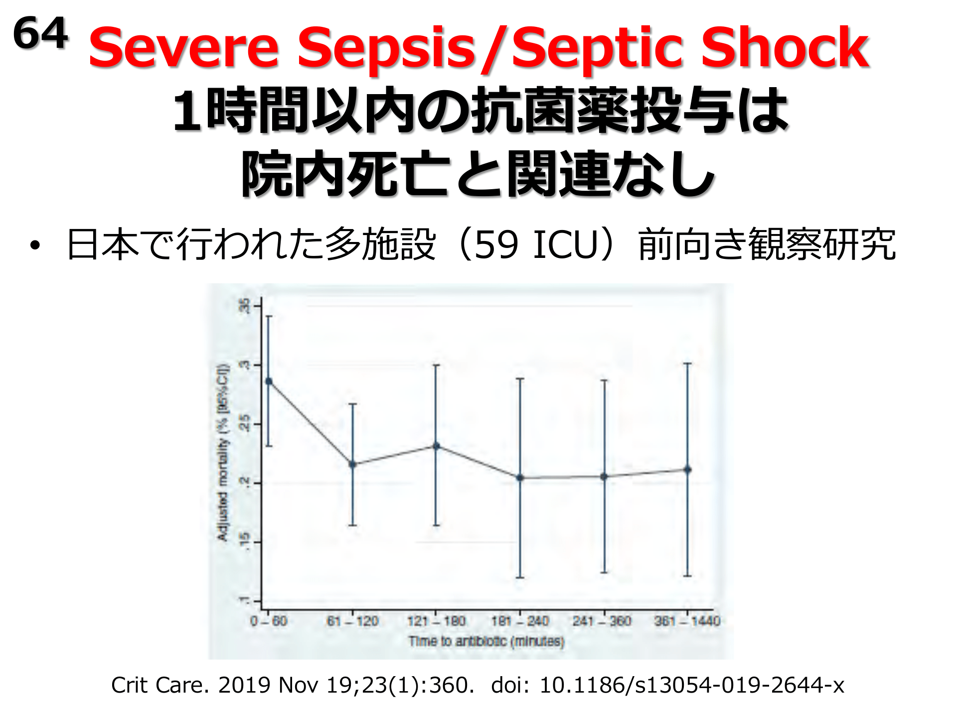 #83. 64 Severe Sepsis/Septic Shock 1時間以内の抗菌薬投与は 院内死亡と関連なし • 日本で行われた多施設(59 ICU)前向き観察研究 Crit Care. 2019 Nov 19;23(1):360. doi: 10.1186/s13054-019-2644-x