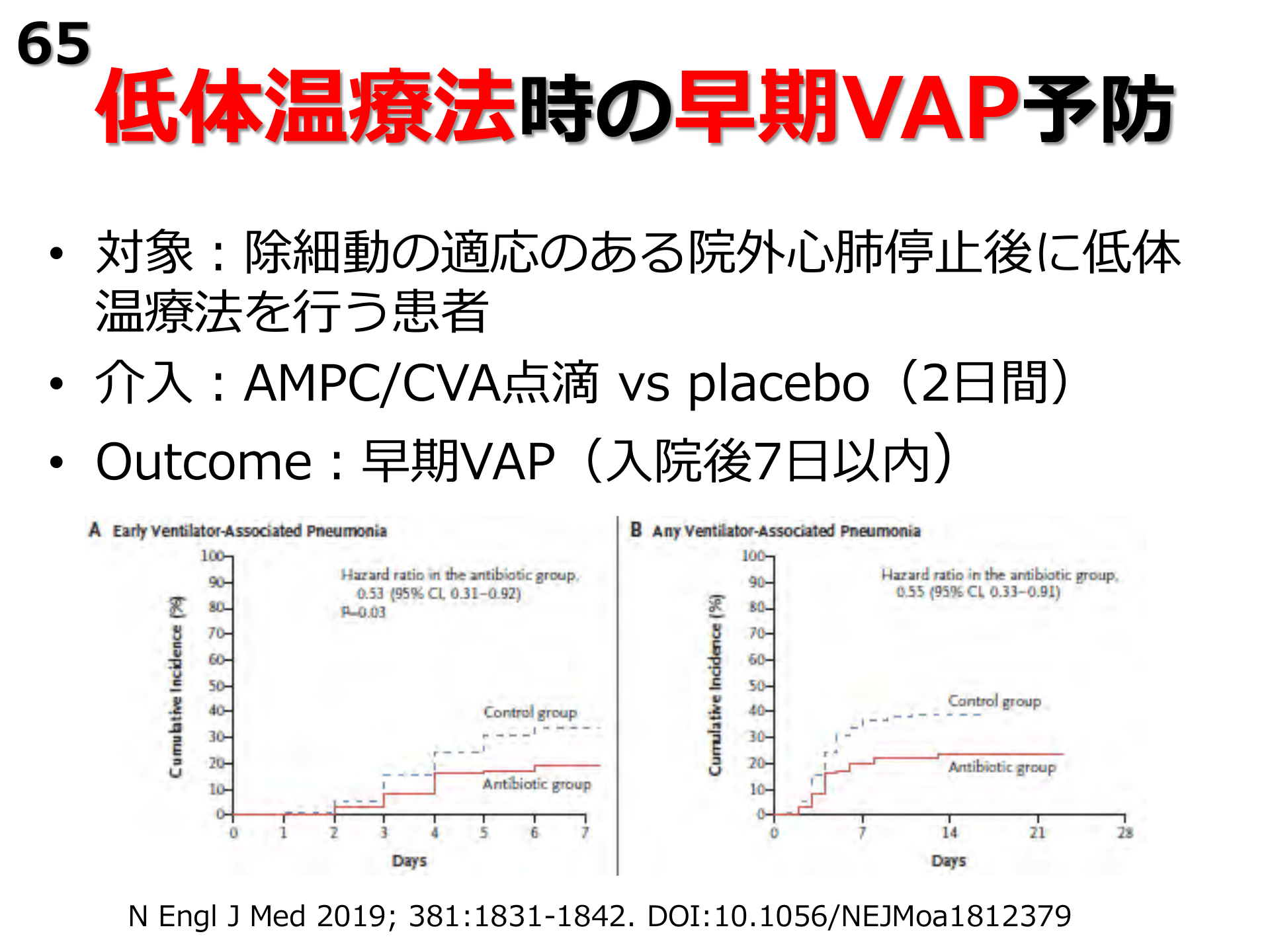 #84. 65 低体温療法時の早期VAP予防 • 対象:除細動の適応のある院外心肺停止後に低体 温療法を行う患者 • 介入:AMPC/CVA点滴 vs placebo(2日間) • Outcome:早期VAP(入院後7日以内) N Engl J Med 2019; 381:1831-1842. DOI:10.1056/NEJMoa1812379
