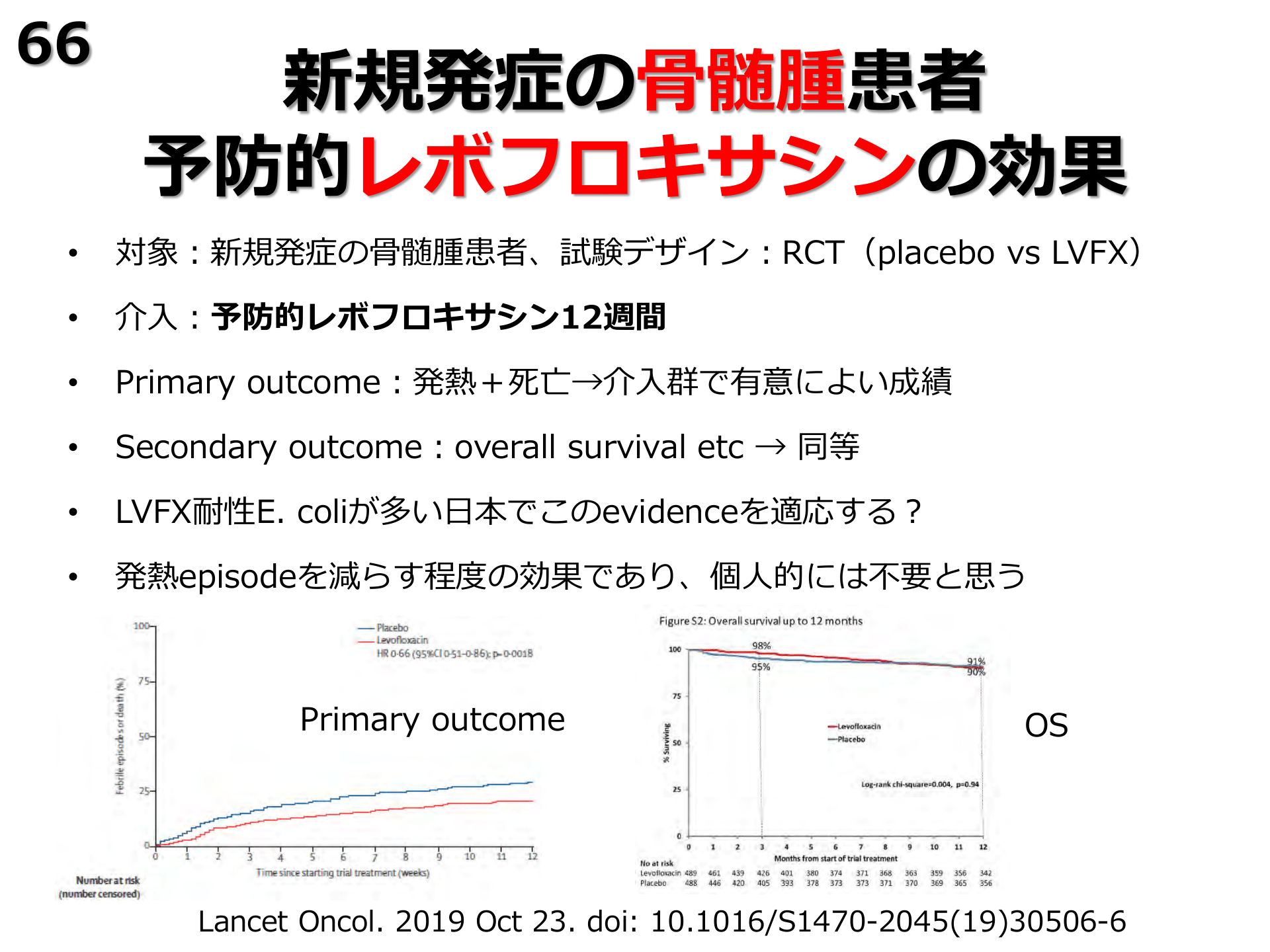 #86. 66 新規発症の骨髄腫患者 予防的レボフロキサシンの効果 • 対象:新規発症の骨髄腫患者、試験デザイン:RCT(placebo vs LVFX) • 介入:予防的レボフロキサシン12週間 • Primary outcome:発熱+死亡→介入群で有意によい成績 • Secondary outcome:overall survival etc → 同等 • LVFX耐性E. coliが多い日本でこのevidenceを適応する? • 発熱episodeを減らす程度の効果であり、個人的には不要と思う Primary outcome OS Lancet Oncol. 2019 Oct 23. doi: 10.1016/S1470-2045(19)30506-6