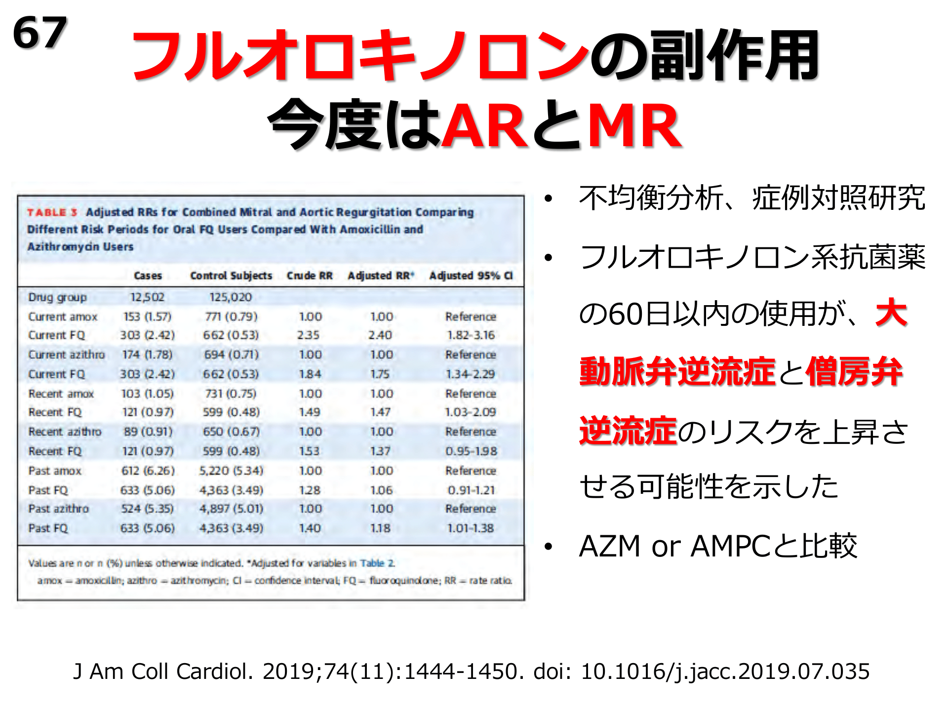 #87. 67 フルオロキノロンの副作用 今度はARとMR • 不均衡分析、症例対照研究 • フルオロキノロン系抗菌薬 の60日以内の使用が、大 動脈弁逆流症と僧房弁 逆流症のリスクを上昇さ せる可能性を示した • AZM or AMPCと比較 J Am Coll Cardiol. 2019;74(11):1444-1450. doi: 10.1016/j.jacc.2019.07.035