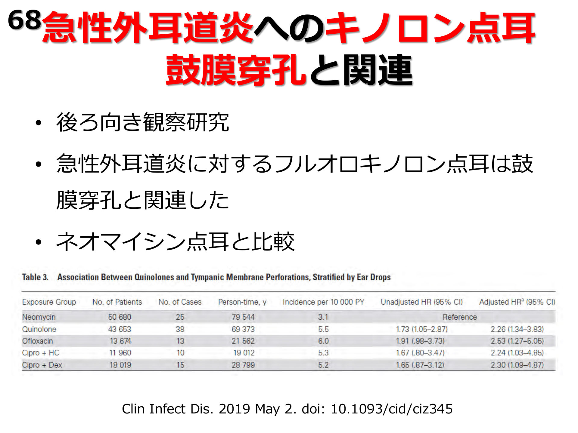 #88. 68急性外耳道炎へのキノロン点耳 鼓膜穿孔と関連 • 後ろ向き観察研究 • 急性外耳道炎に対するフルオロキノロン点耳は鼓 膜穿孔と関連した • ネオマイシン点耳と比較 Clin Infect Dis. 2019 May 2. doi: 10.1093/cid/ciz345