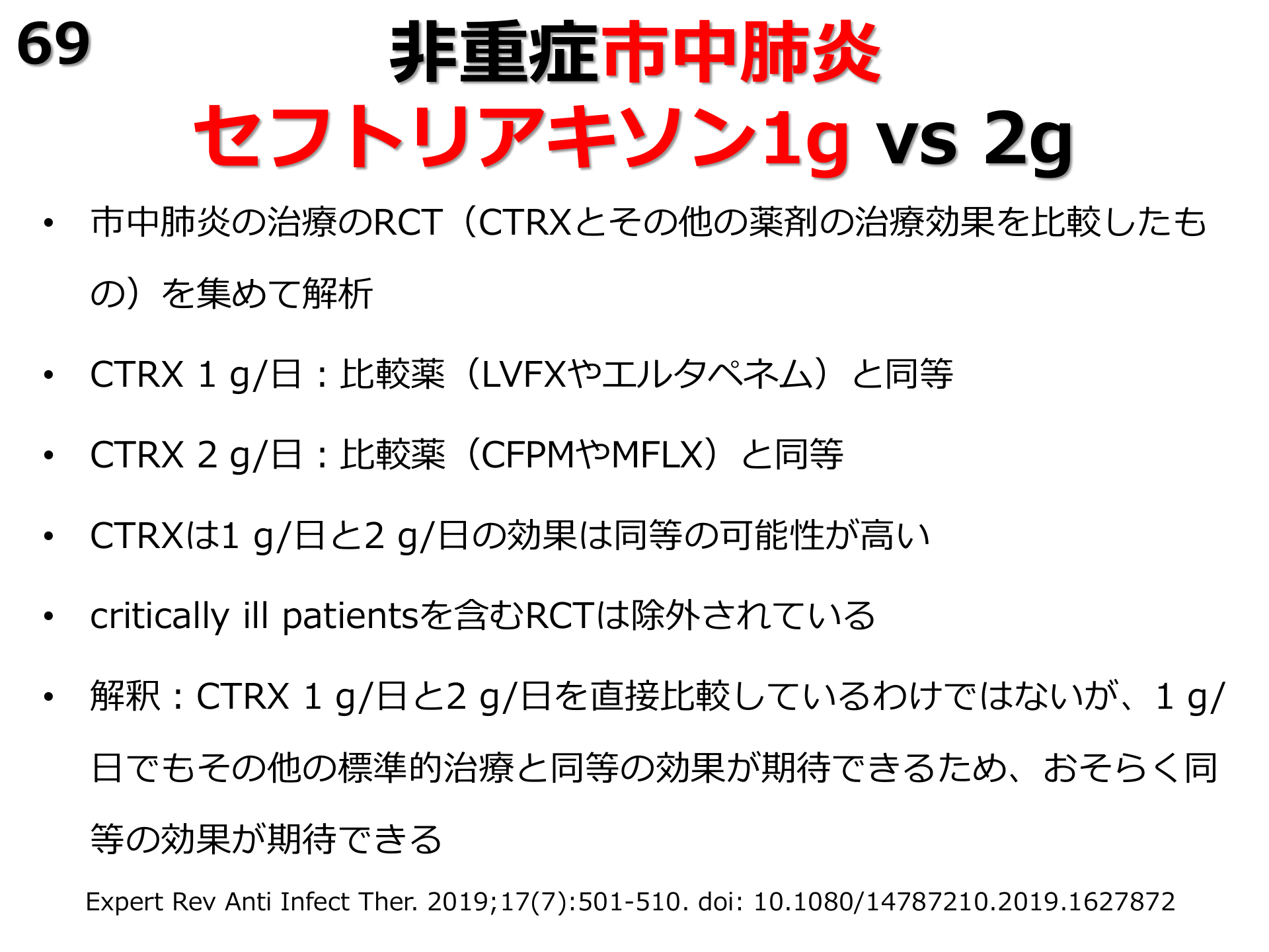 #89. 69 非重症市中肺炎 セフトリアキソン1g vs 2g • 市中肺炎の治療のRCT(CTRXとその他の薬剤の治療効果を比較したも の)を集めて解析 • CTRX 1 g/日:比較薬(LVFXやエルタペネム)と同等 • CTRX 2 g/日:比較薬(CFPMやMFLX)と同等 • CTRXは1 g/日と2 g/日の効果は同等の可能性が高い • critically ill patientsを含むRCTは除外されている • 解釈:CTRX 1 g/日と2 g/日を直接比較しているわけではないが、1 g/ 日でもその他の標準的治療と同等の効果が期待できるため、おそらく同 等の効果が期待できる Expert Rev Anti Infect Ther. 2019;17(7):501-510. doi: 10.1080/14787210.2019.1627872