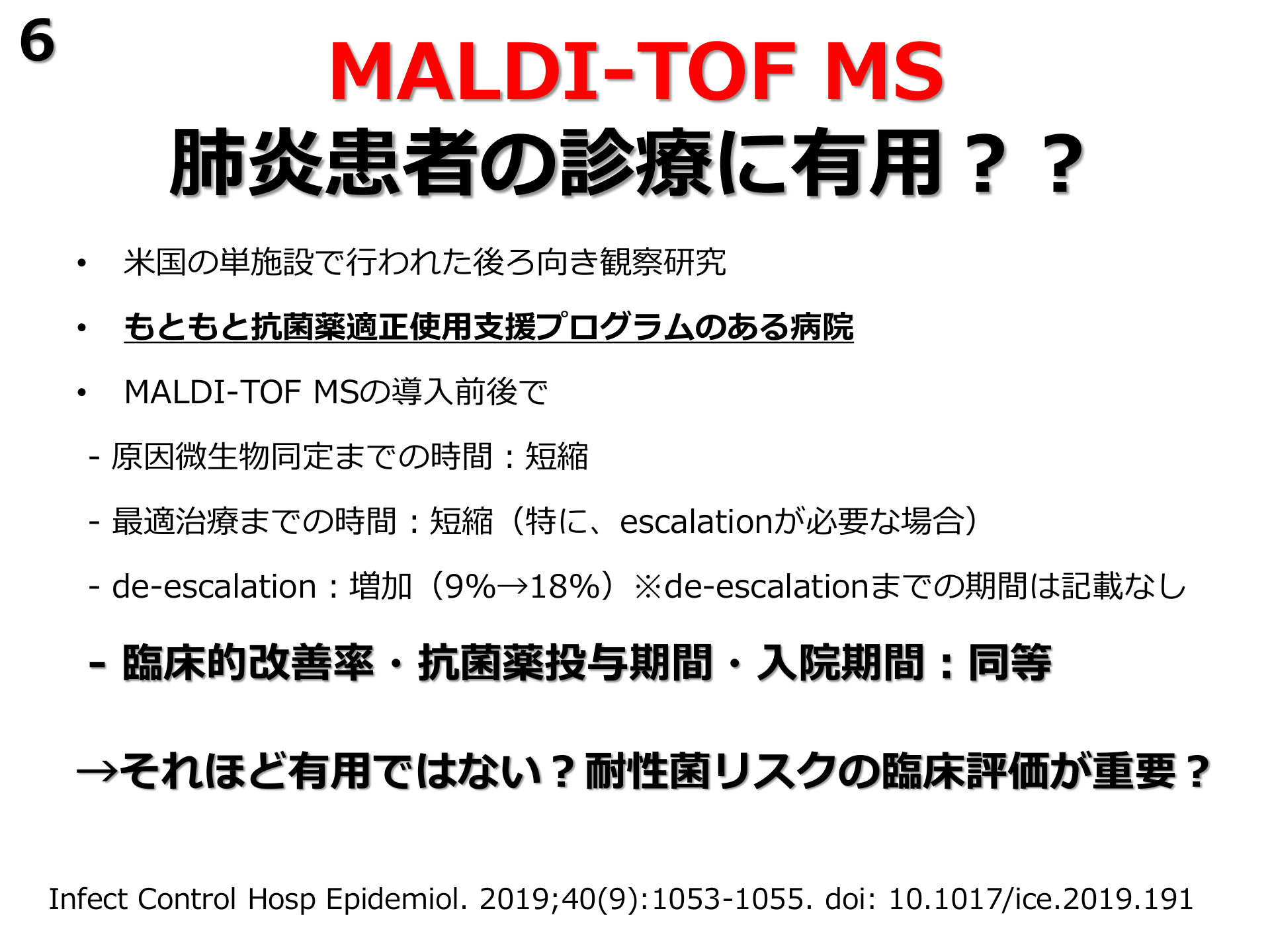 #9. 6 MALDI-TOF MS 肺炎患者の診療に有用?? • 米国の単施設で行われた後ろ向き観察研究 • もともと抗菌薬適正使用支援プログラムのある病院 • MALDI-TOF MSの導入前後で - 原因微生物同定までの時間:短縮 - 最適治療までの時間:短縮(特に、escalationが必要な場合) - de-escalation:増加(9%→18%)※de-escalationまでの期間は記載なし - 臨床的改善率・抗菌薬投与期間・入院期間:同等 →それほど有用ではない?耐性菌リスクの臨床評価が重要? Infect Control Hosp Epidemiol. 2019;40(9):1053-1055. doi: 10.1017/ice.2019.191
