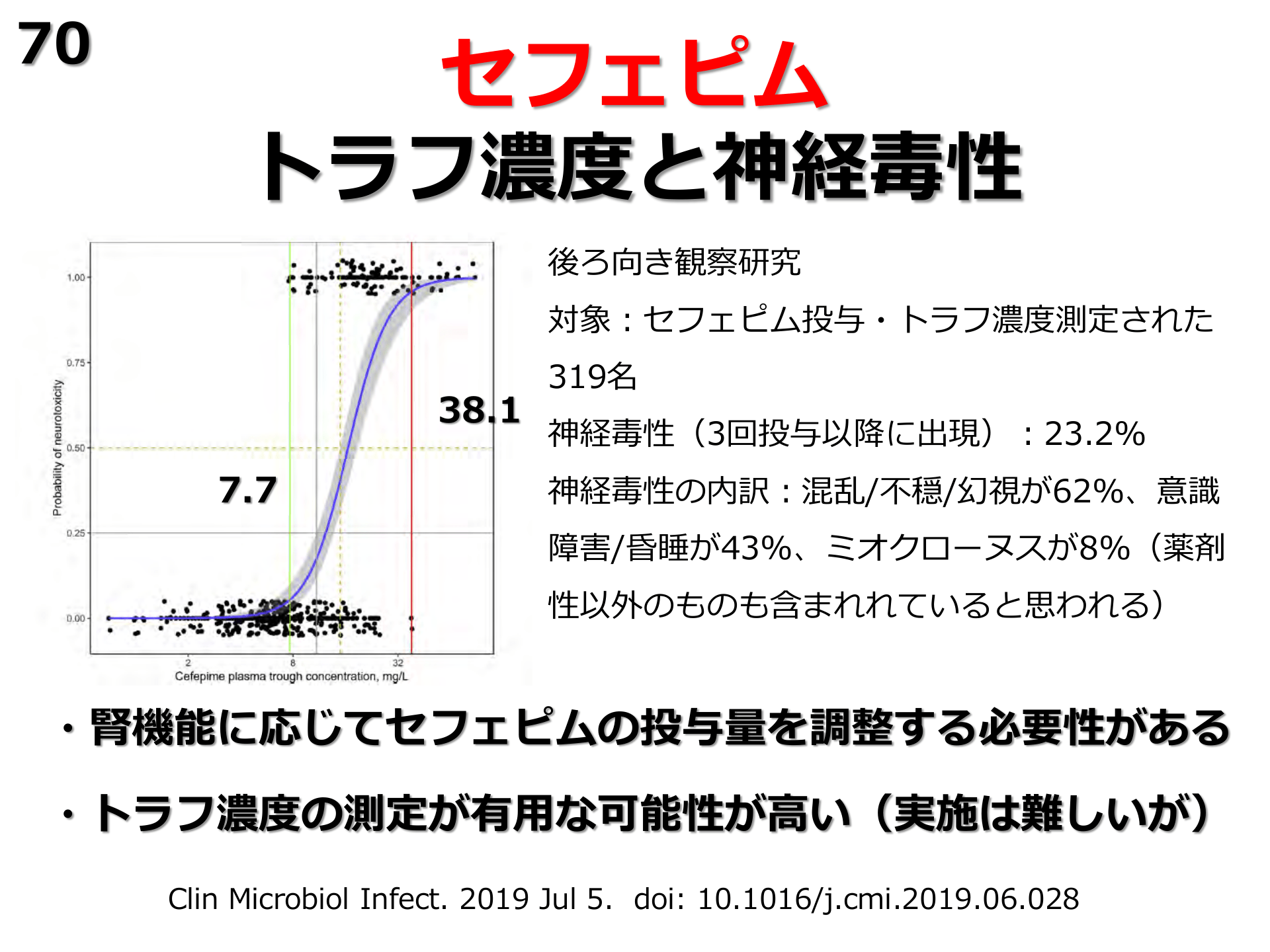 #90. 70 セフェピム トラフ濃度と神経毒性 後ろ向き観察研究 対象:セフェピム投与・トラフ濃度測定された 38.1 7.7 319名 神経毒性(3回投与以降に出現):23.2% 神経毒性の内訳:混乱/不穏/幻視が62%、意識 障害/昏睡が43%、ミオクローヌスが8%(薬剤 性以外のものも含まれれていると思われる) ・腎機能に応じてセフェピムの投与量を調整する必要性がある ・トラフ濃度の測定が有用な可能性が高い(実施は難しいが) Clin Microbiol Infect. 2019 Jul 5. doi: 10.1016/j.cmi.2019.06.028