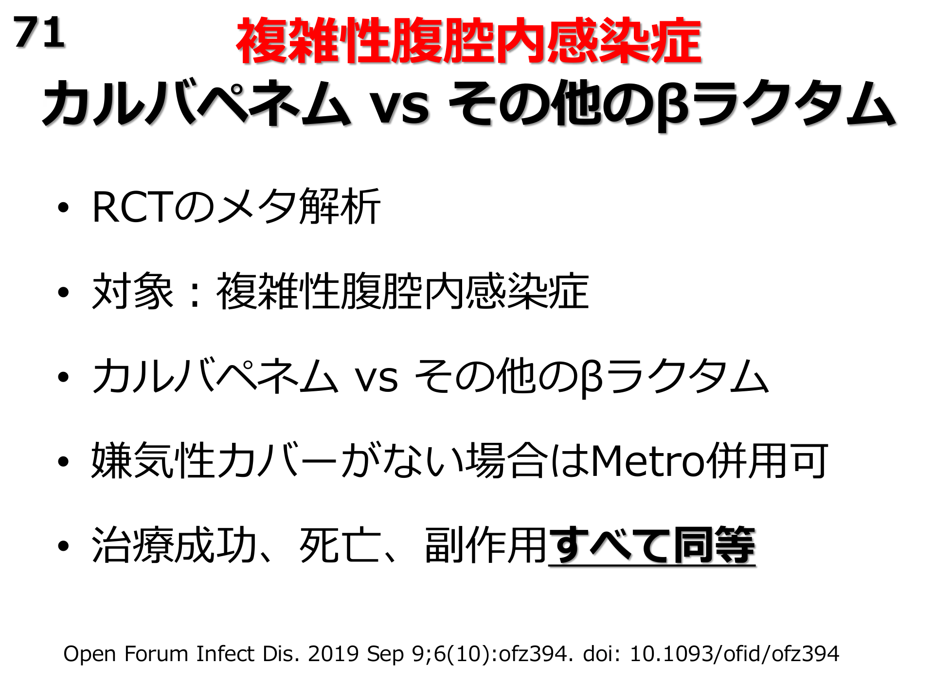 #91. 71 複雑性腹腔内感染症 カルバペネム vs その他のβラクタム • RCTのメタ解析 • 対象:複雑性腹腔内感染症 • カルバペネム vs その他のβラクタム • 嫌気性カバーがない場合はMetro併用可 • 治療成功、死亡、副作用すべて同等 Open Forum Infect Dis. 2019 Sep 9;6(10):ofz394. doi: 10.1093/ofid/ofz394