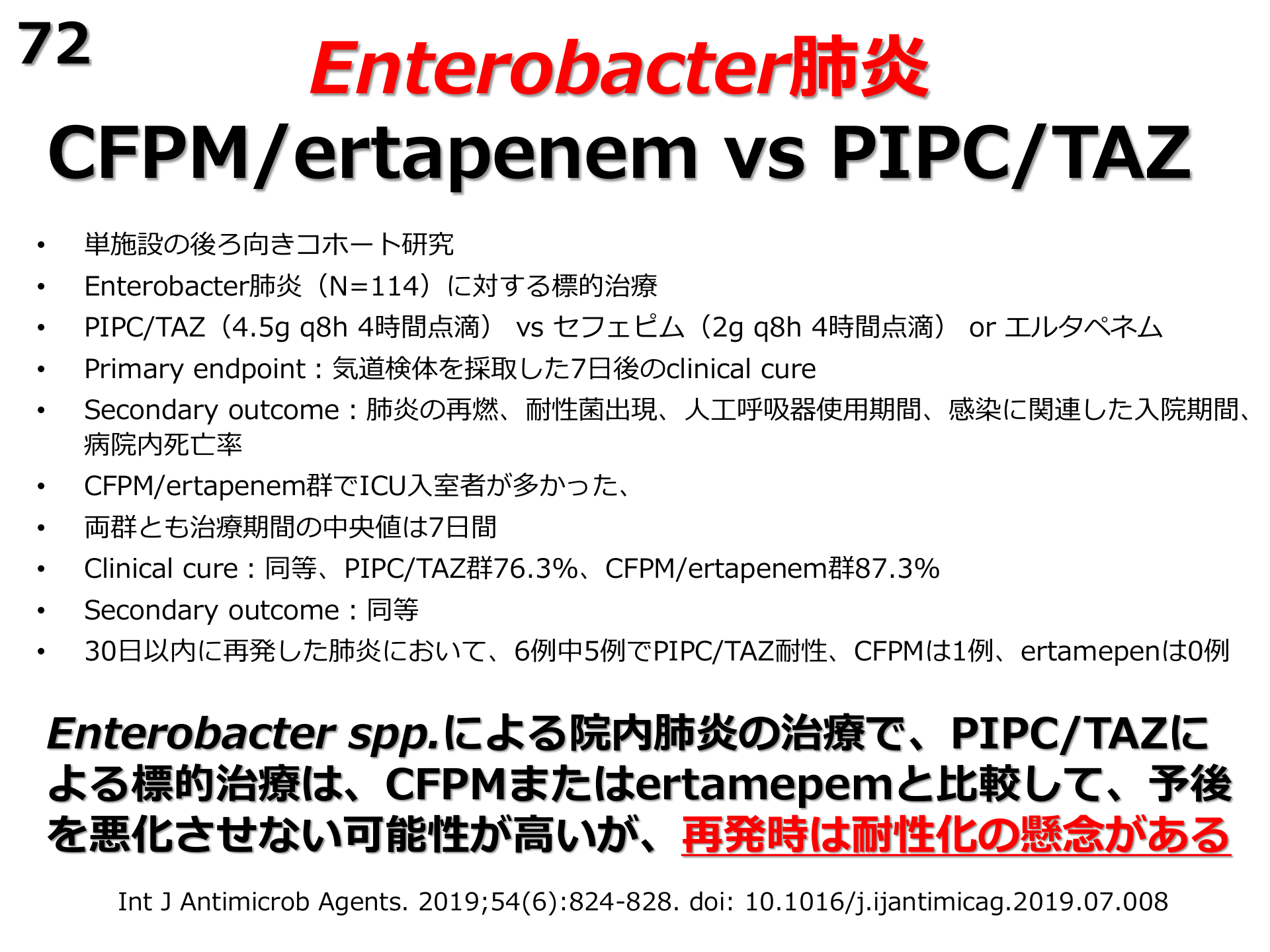 #92. 72 Enterobacter肺炎 CFPM/ertapenem vs PIPC/TAZ • 単施設の後ろ向きコホート研究 • Enterobacter肺炎(N=114)に対する標的治療 • PIPC/TAZ(4.5g q8h 4時間点滴) vs セフェピム(2g q8h 4時間点滴) or エルタペネム • Primary endpoint:気道検体を採取した7日後のclinical cure • Secondary outcome:肺炎の再燃、耐性菌出現、人工呼吸器使用期間、感染に関連した入院期間、 病院内死亡率 • CFPM/ertapenem群でICU入室者が多かった、 • 両群とも治療期間の中央値は7日間 • Clinical cure:同等、PIPC/TAZ群76.3%、CFPM/ertapenem群87.3% • Secondary outcome:同等 • 30日以内に再発した肺炎において、6例中5例でPIPC/TAZ耐性、CFPMは1例、ertamepenは0例 Enterobacter spp.による院内肺炎の治療で、PIPC/TAZに よる標的治療は、CFPMまたはertamepemと比較して、予後 を悪化させない可能性が高いが、再発時は耐性化の懸念がある Int J Antimicrob Agents. 2019;54(6):824-828. doi: 10.1016/j.ijantimicag.2019.07.008