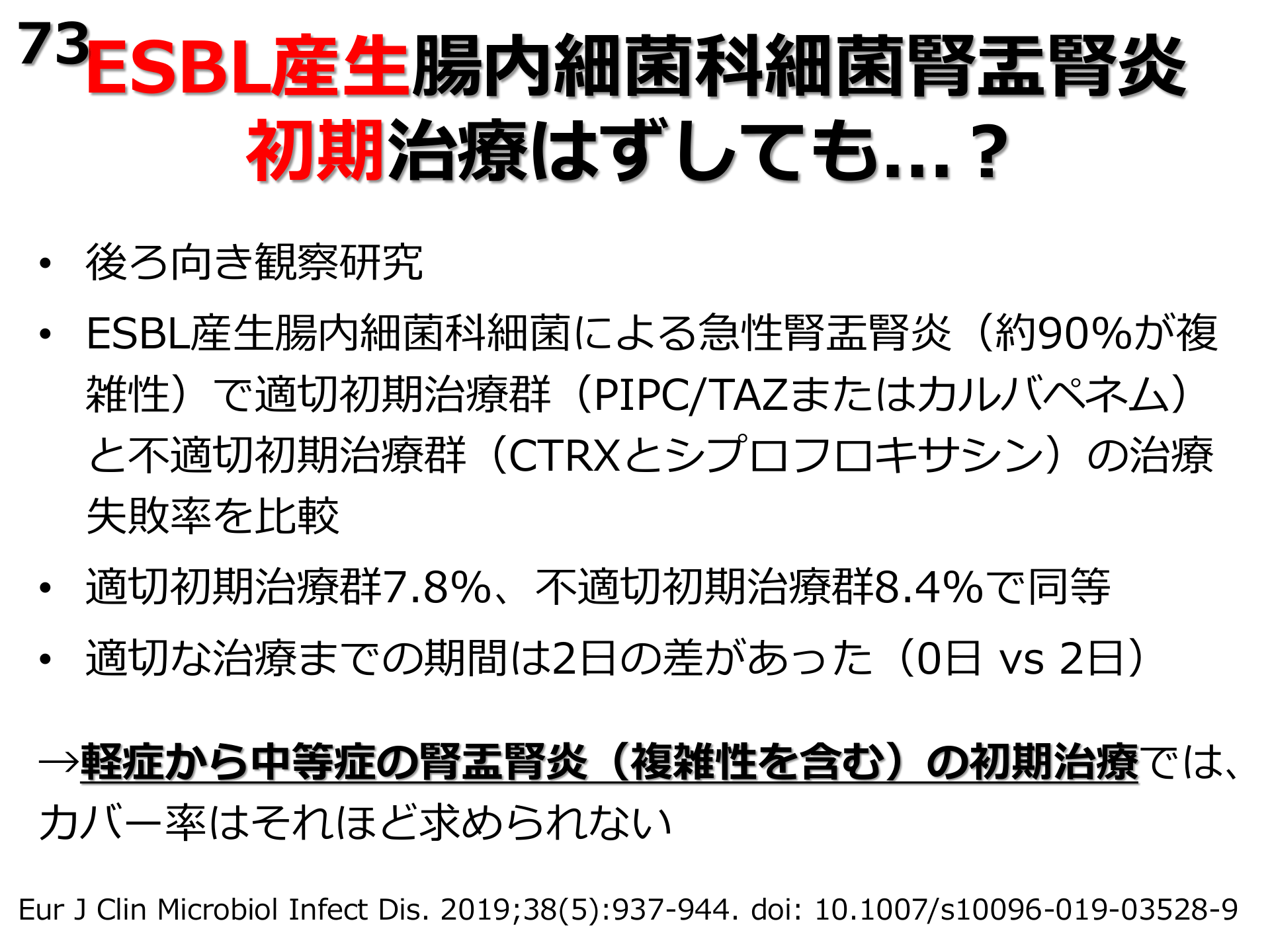 #93. 73 ESBL産生腸内細菌科細菌腎盂腎炎 初期治療はずしても...? • 後ろ向き観察研究 • ESBL産生腸内細菌科細菌による急性腎盂腎炎(約90%が複 雑性)で適切初期治療群(PIPC/TAZまたはカルバペネム) と不適切初期治療群(CTRXとシプロフロキサシン)の治療 失敗率を比較 • 適切初期治療群7.8%、不適切初期治療群8.4%で同等 • 適切な治療までの期間は2日の差があった(0日 vs 2日) →軽症から中等症の腎盂腎炎(複雑性を含む)の初期治療では、 カバー率はそれほど求められない Eur J Clin Microbiol Infect Dis. 2019;38(5):937-944. doi: 10.1007/s10096-019-03528-9
