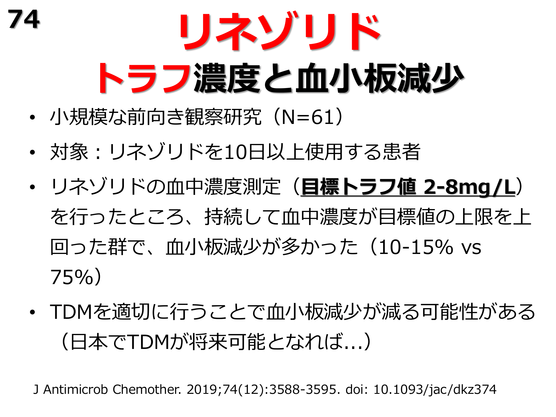 #94. 74 リネゾリド トラフ濃度と血小板減少 • 小規模な前向き観察研究(N=61) • 対象:リネゾリドを10日以上使用する患者 • リネゾリドの血中濃度測定(目標トラフ値 2-8mg/L) を行ったところ、持続して血中濃度が目標値の上限を上 回った群で、血小板減少が多かった(10-15% vs 75%) • TDMを適切に行うことで血小板減少が減る可能性がある (日本でTDMが将来可能となれば...) J Antimicrob Chemother. 2019;74(12):3588-3595. doi: 10.1093/jac/dkz374