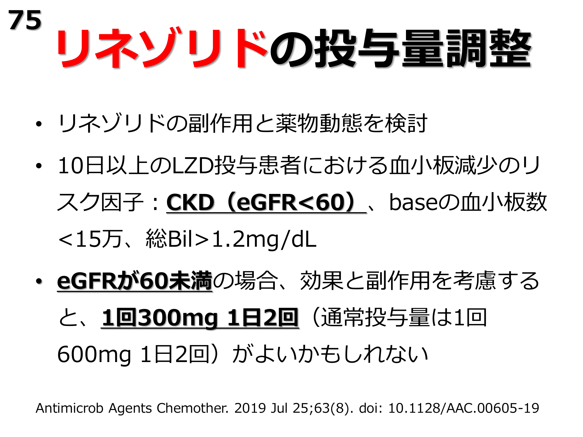 #95. 75 リネゾリドの投与量調整 • リネゾリドの副作用と薬物動態を検討 • 10日以上のLZD投与患者における血小板減少のリ スク因子:CKD(eGFR<60)、baseの血小板数 <15万、総Bil>1.2mg/dL • eGFRが60未満の場合、効果と副作用を考慮する と、1回300mg 1日2回(通常投与量は1回 600mg 1日2回)がよいかもしれない Antimicrob Agents Chemother. 2019 Jul 25;63(8). doi: 10.1128/AAC.00605-19