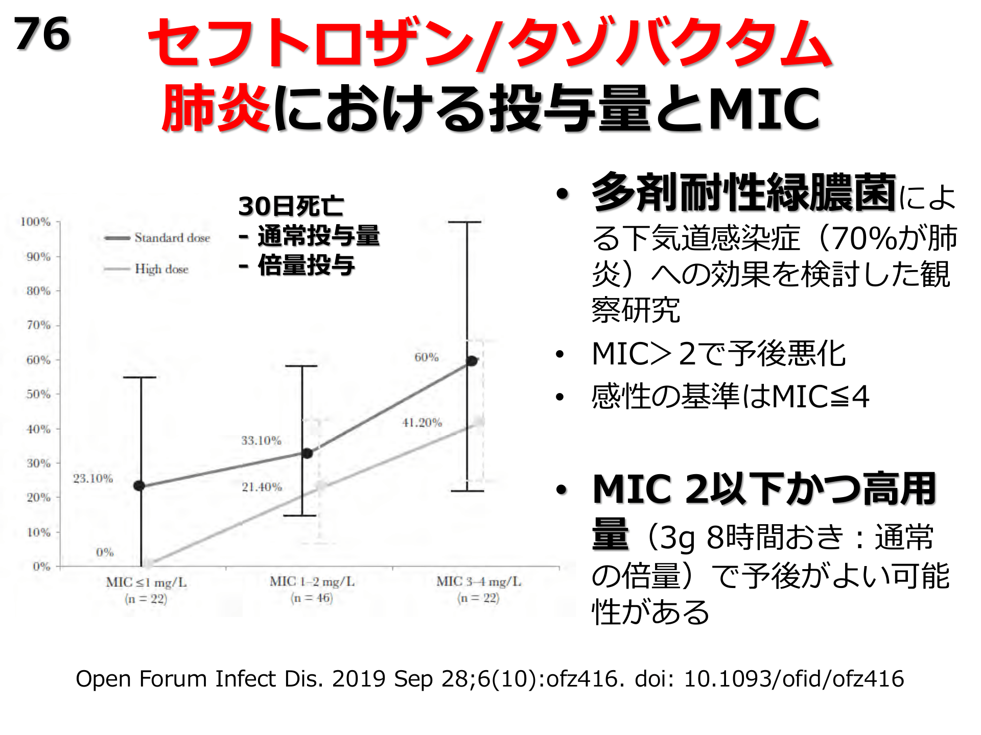 #97. 76 セフトロザン/タゾバクタム 肺炎における投与量とMIC 30日死亡 - 通常投与量 - 倍量投与 • 多剤耐性緑膿菌によ る下気道感染症(70%が肺 炎)への効果を検討した観 察研究 • MIC>2で予後悪化 • 感性の基準はMIC≦4 • MIC 2以下かつ高用 量(3g 8時間おき:通常 の倍量)で予後がよい可能 性がある Open Forum Infect Dis. 2019 Sep 28;6(10):ofz416. doi: 10.1093/ofid/ofz416