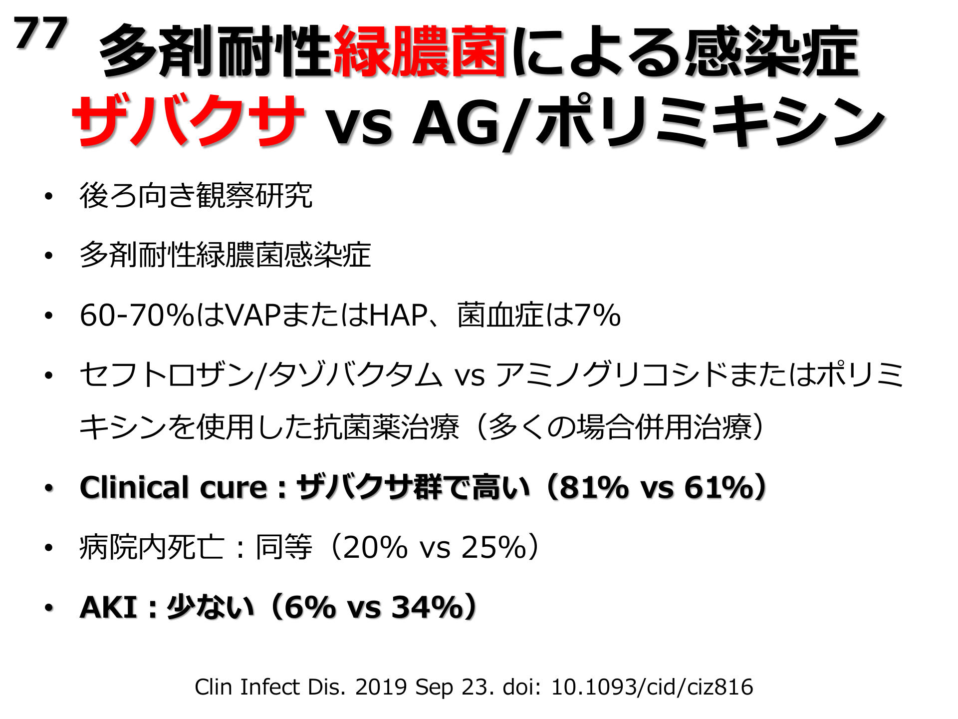 #98. 77 多剤耐性緑膿菌による感染症 ザバクサ vs AG/ポリミキシン • 後ろ向き観察研究 • 多剤耐性緑膿菌感染症 • 60-70%はVAPまたはHAP、菌血症は7% • セフトロザン/タゾバクタム vs アミノグリコシドまたはポリミ キシンを使用した抗菌薬治療(多くの場合併用治療) • Clinical cure:ザバクサ群で高い(81% vs 61%) • 病院内死亡:同等(20% vs 25%) • AKI:少ない(6% vs 34%) Clin Infect Dis. 2019 Sep 23. doi: 10.1093/cid/ciz816