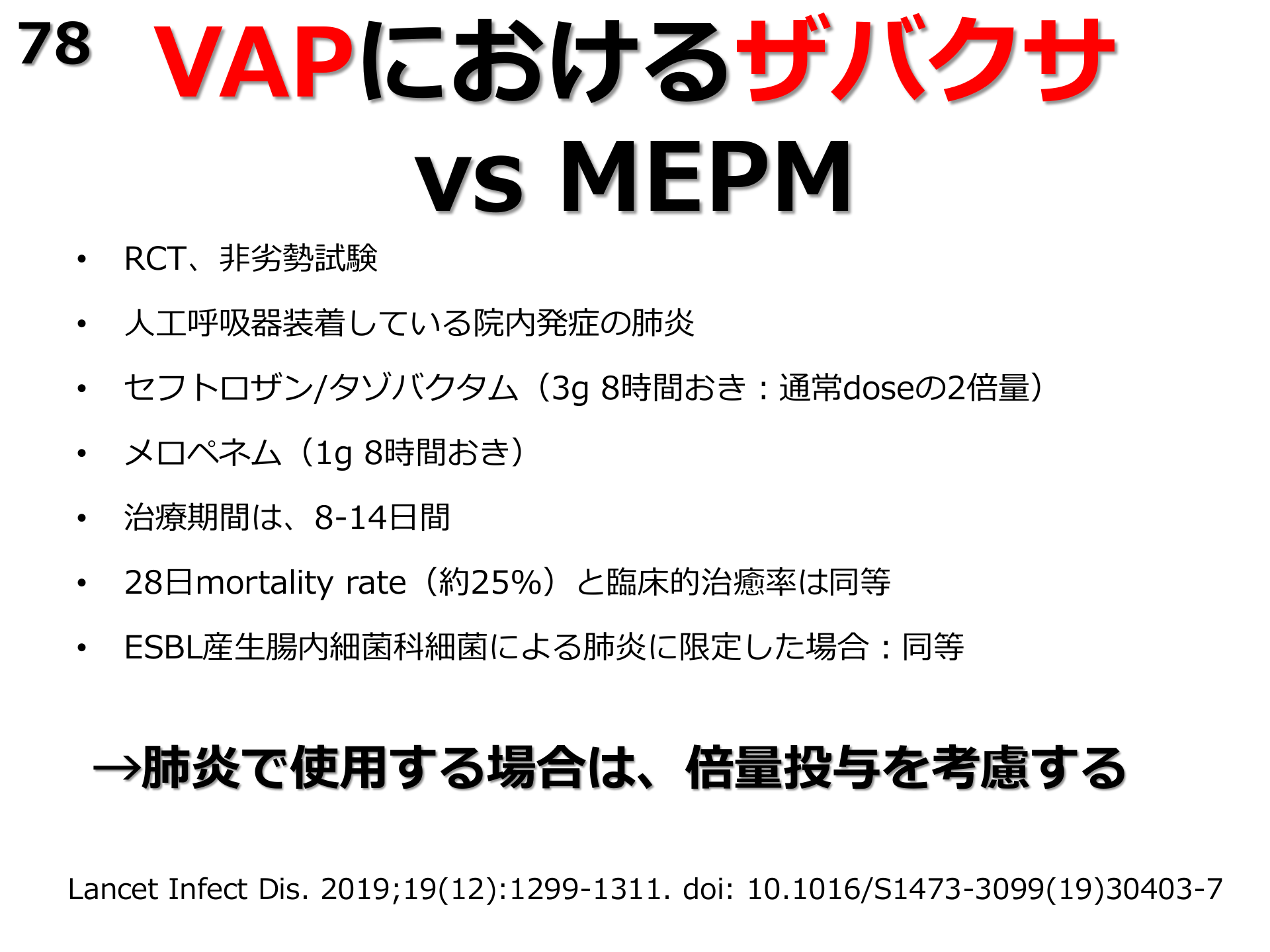 #99. 78 VAPにおけるザバクサ vs MEPM • RCT、非劣勢試験 • 人工呼吸器装着している院内発症の肺炎 • セフトロザン/タゾバクタム(3g 8時間おき:通常doseの2倍量) • メロペネム(1g 8時間おき) • 治療期間は、8-14日間 • 28日mortality rate(約25%)と臨床的治癒率は同等 • ESBL産生腸内細菌科細菌による肺炎に限定した場合:同等 →肺炎で使用する場合は、倍量投与を考慮する Lancet Infect Dis. 2019;19(12):1299-1311. doi: 10.1016/S1473-3099(19)30403-7