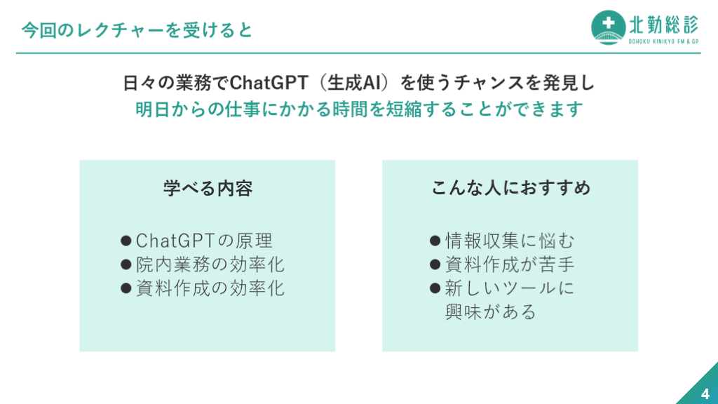 明日からの仕事にかかる時間を短縮することができます 4 学べる内容 こんな人におすすめ ChatGPTの原理