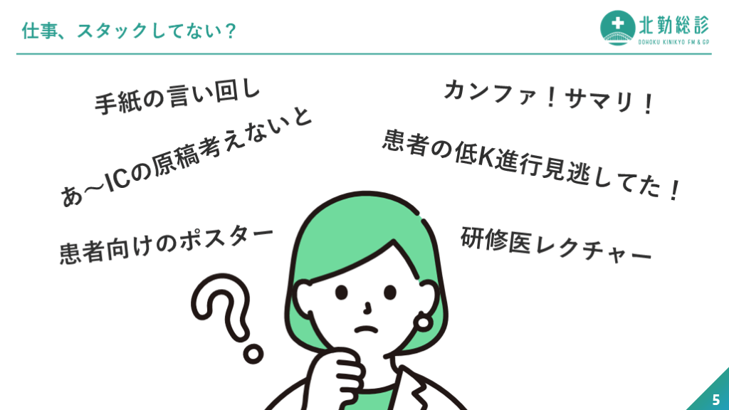 #5. 仕事、スタックしてない? 5 あ〜ICの原稿考えないと 患者の低K進行見逃してた! 手紙の言い回し カンファ!サマリ! 研修医レクチャー 患者向けのポスター