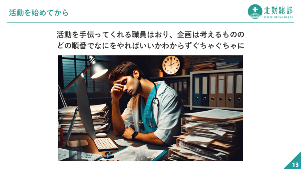 #13. 活動を始めてから 活動を手伝ってくれる職員はおり、企画は考えるものの