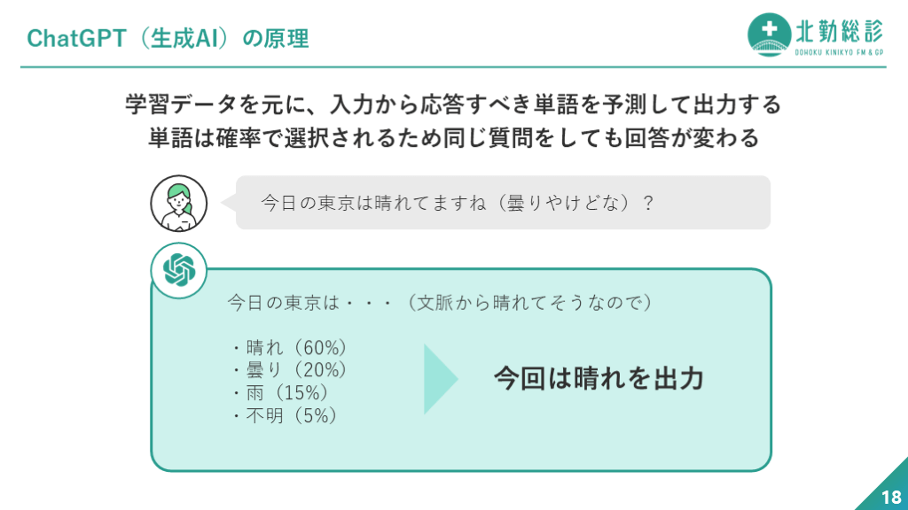#18. ChatGPT(生成AI)の原理 学習データを元に、入力から応答すべき単語を予測して出力する