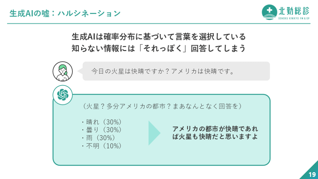 知らない情報には「それっぽく」回答してしまう 19 今日の火星は快晴ですか?アメリカは快晴です。 (火星?多分アメリカの都市?まあなんとなく回答を) ・晴れ(30%)