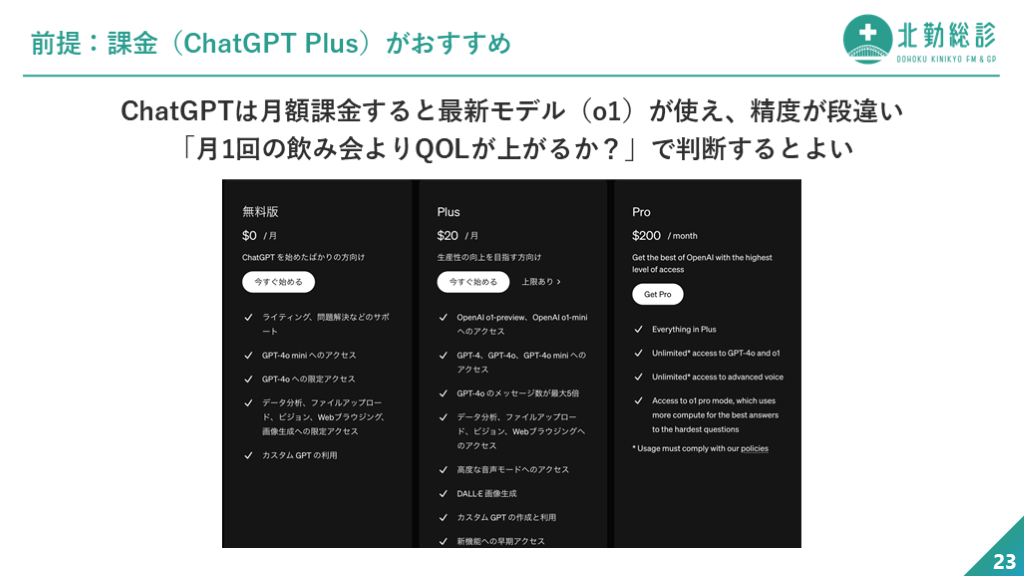 #23. 前提:課金(ChatGPT Plus)がおすすめ ChatGPTは月額課金すると最新モデル(o1)が使え、精度が段違い