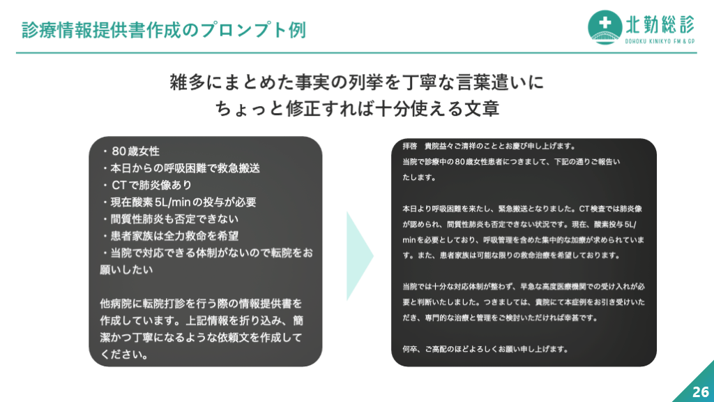 #26. 診療情報提供書作成のプロンプト例 雑多にまとめた事実の列挙を丁寧な言葉遣いに