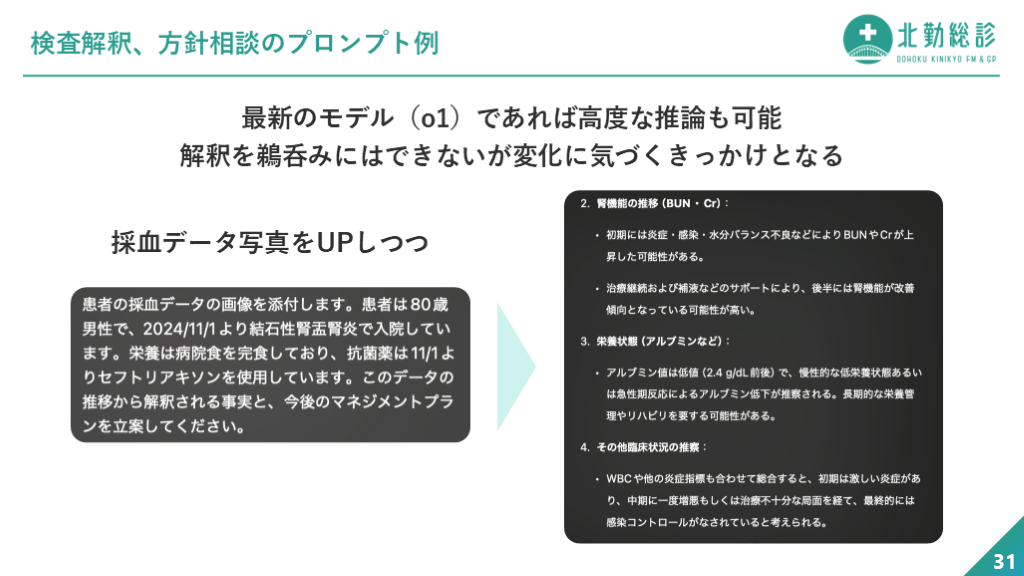 #31. 検査解釈、方針相談のプロンプト例 最新のモデル(o1)であれば高度な推論も可能