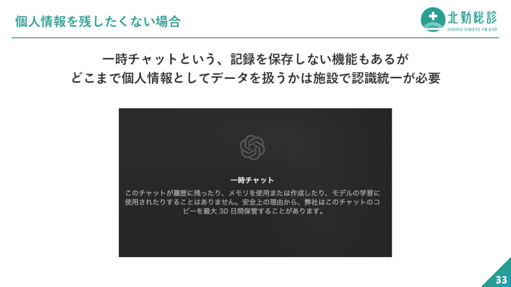#33. 個人情報を残したくない場合 一時チャットという、記録を保存しない機能もあるが