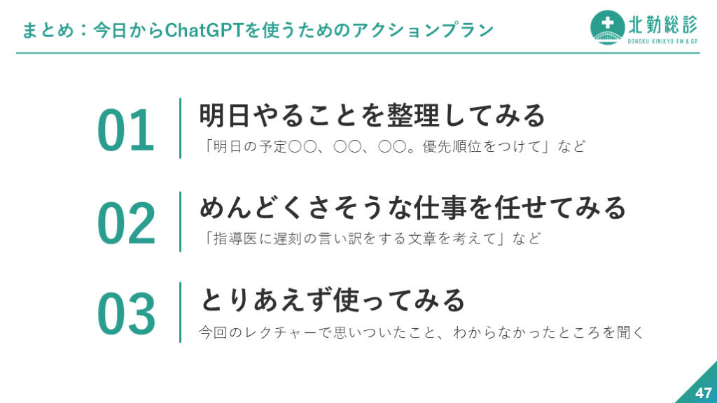 #47. まとめ:今日からChatGPTを使うためのアクションプラン 47 明日やることを整理してみる 01 02 03 めんどくさそうな仕事を任せてみる とりあえず使ってみる 「指導医に遅刻の言い訳をする文章を考えて」など 「明日の予定○○、○○、○○。優先順位をつけて」など 今回のレクチャーで思いついたこと、わからなかったところを聞く