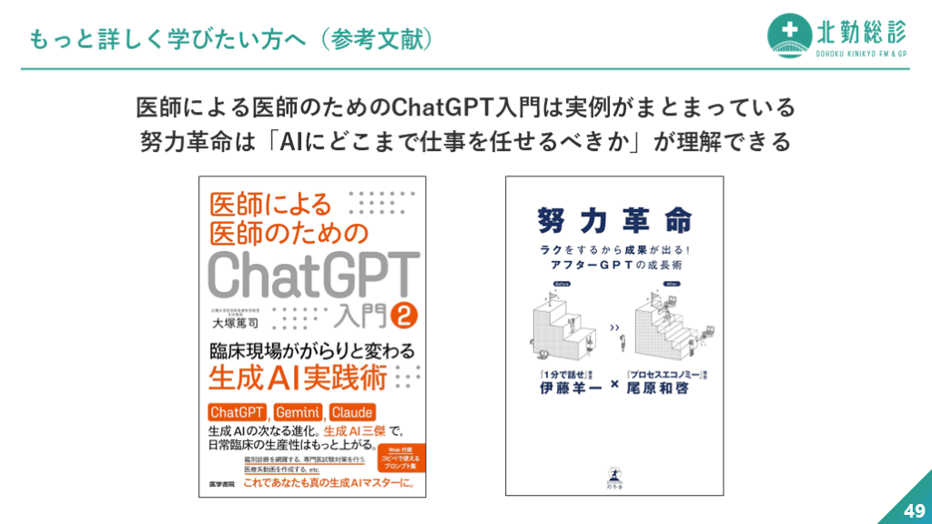 #49. もっと詳しく学びたい方へ(参考文献) 医師による医師のためのChatGPT入門は実例がまとまっている