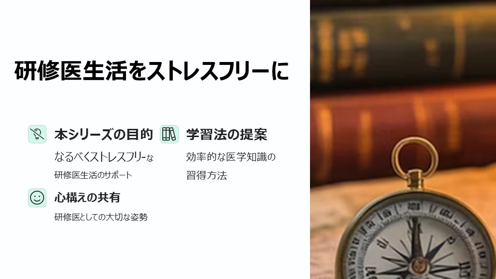 本シリーズの目的 なるべくストレスフリ-な研修医生活のサポート 学習法の提案 効率的な医学知識の