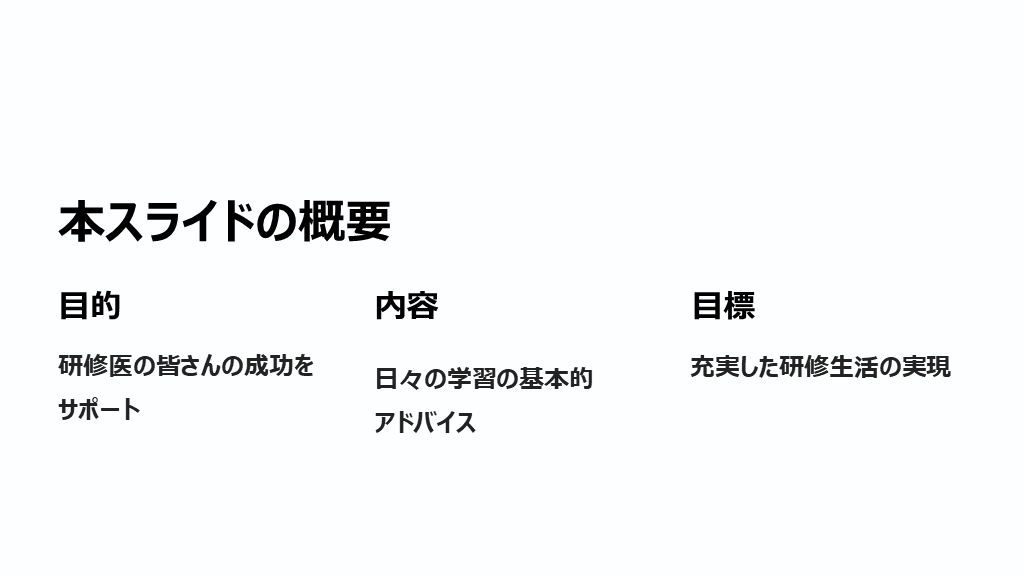 #3. 本スライドの概要 目的 研修医の皆さんの成功を