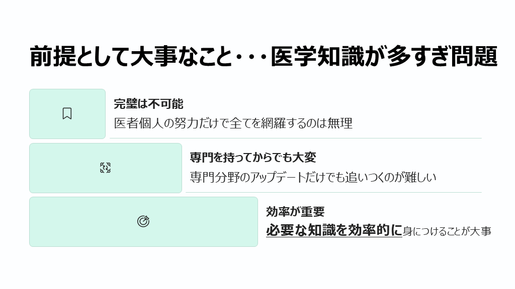 #4. 前提として大事なこと・・・医学知識が多すぎ問題 完璧は不可能 医者個人の努力だけで全てを網羅するのは無理 専門を持ってからでも大変 専門分野のアップデートだけでも追いつくのが難しい 効率が重要 必要な知識を効率的に身につけることが大事