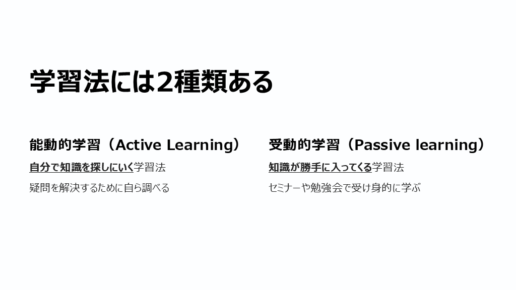 #9. 学習法には2種類ある 能動的学習(Active Learning) 自分で知識を探しにいく学習法 疑問を解決するために自ら調べる 受動的学習(Passive learning) 知識が勝手に入ってくる学習法 セミナーや勉強会で受け身的に学ぶ