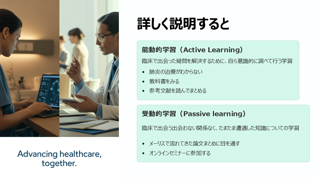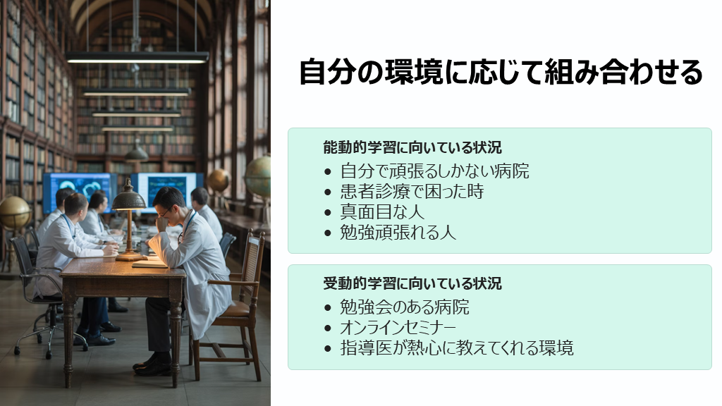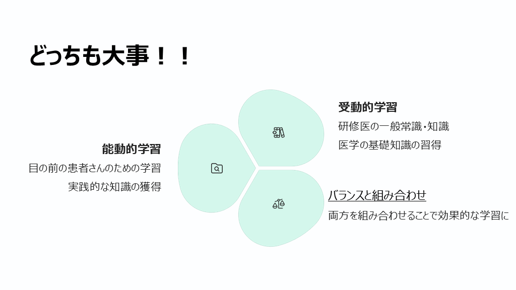 #13. どっちも大事!! 能動的学習 目の前の患者さんのための学習 実践的な知識の獲得 受動的学習 研修医の一般常識・知識 医学の基礎知識の習得 バランスと組み合わせ 両方を組み合わせることで効果的な学習に