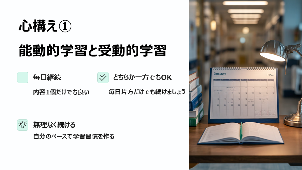 能動的学習と受動的学習 毎日継続 内容1個だけでも良い どちらか一方でもOK 毎日片方だけでも続けましょう 無理なく続ける 自分のペースで学習習慣を作る