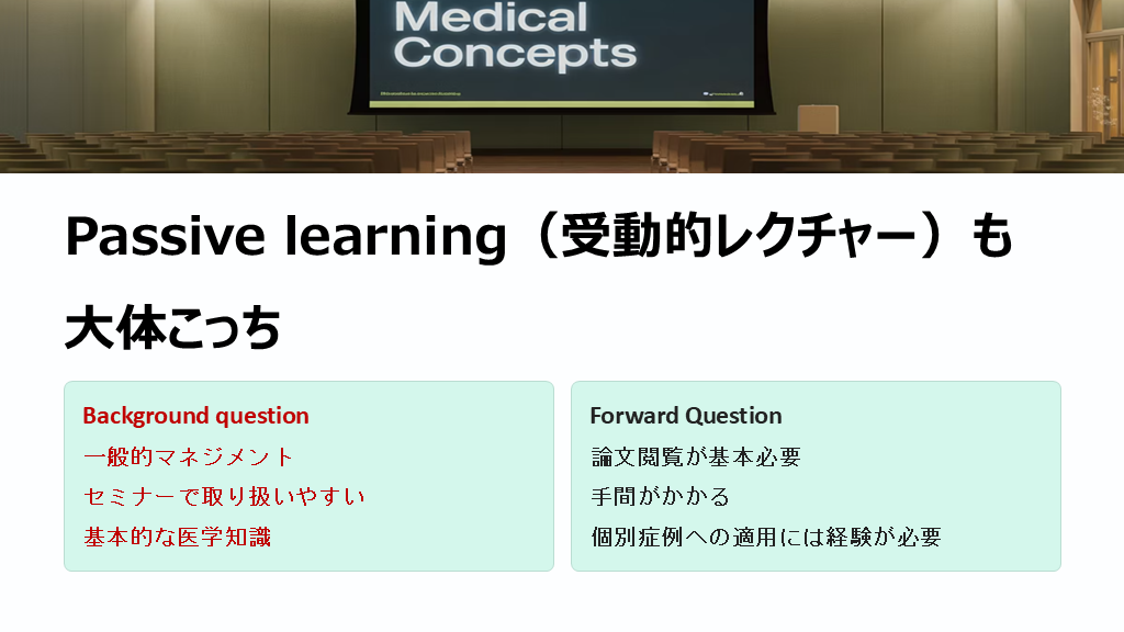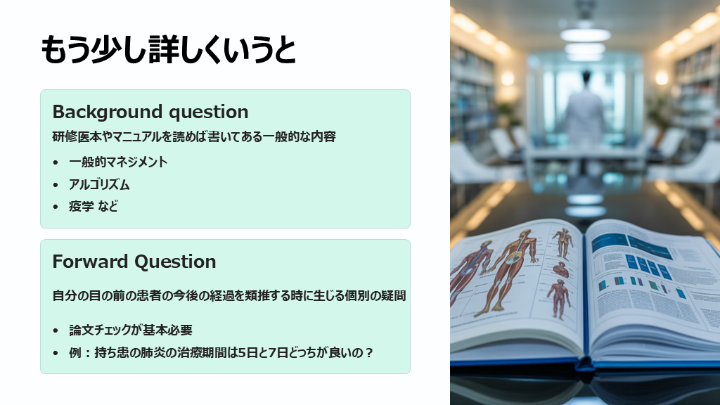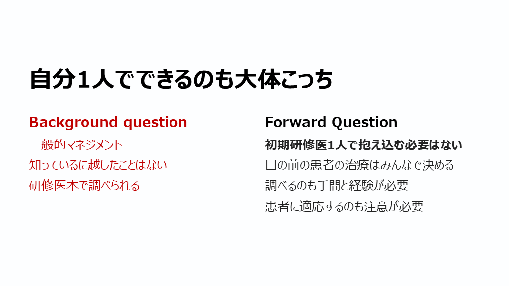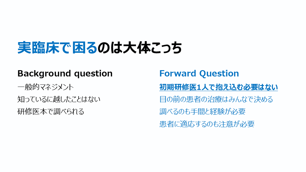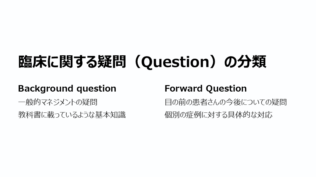 大体こっち Background question 一般的マネジメント セミナーで取り扱いやすい 基本的な医学知識 Forward Question 論文閲覧が基本必要 手間がかかる 個別症例への適用には経験が必要