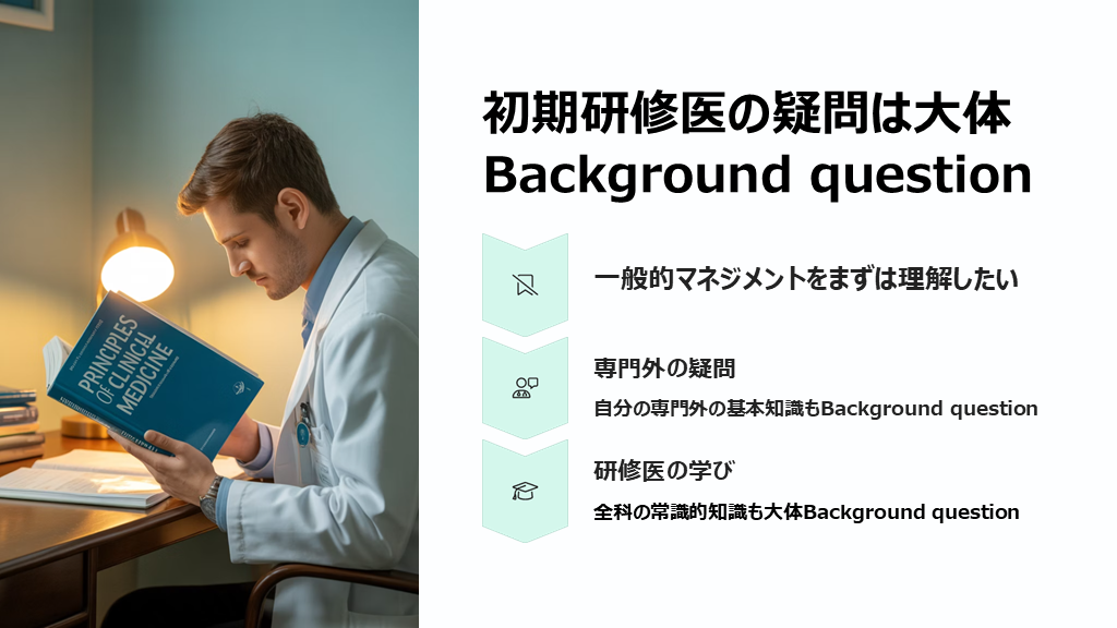 #19. 初期研修医の疑問は大体Background question 一般的マネジメントをまずは理解したい 専門外の疑問 自分の専門外の基本知識もBackground question 研修医の学び 全科の常識的知識も大体Background question