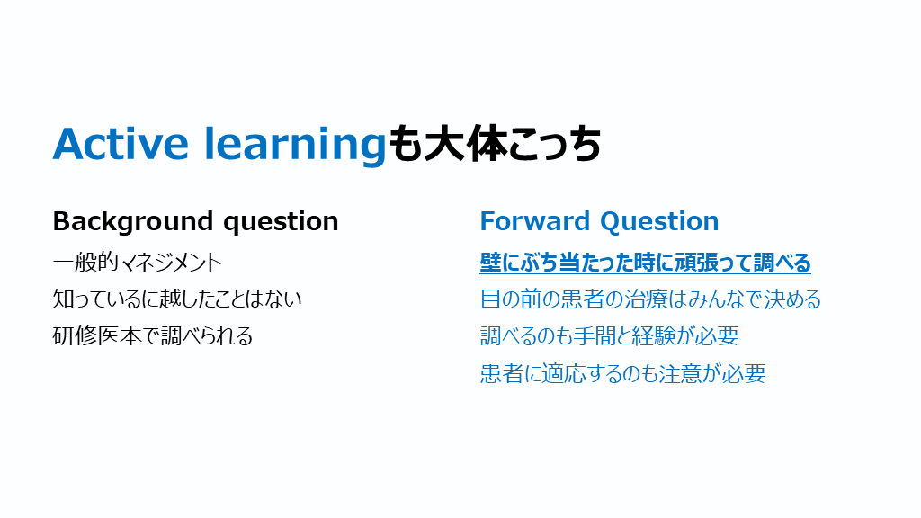 #23. Active learningも大体こっち Background question 一般的マネジメント 知っているに越したことはない 研修医本で調べられる Forward Question 壁にぶち当たった時に頑張って調べる 目の前の患者の治療はみんなで決める 調べるのも手間と経験が必要 患者に適応するのも注意が必要