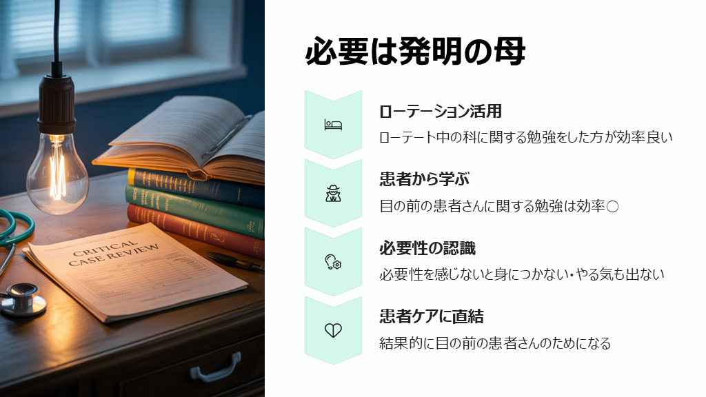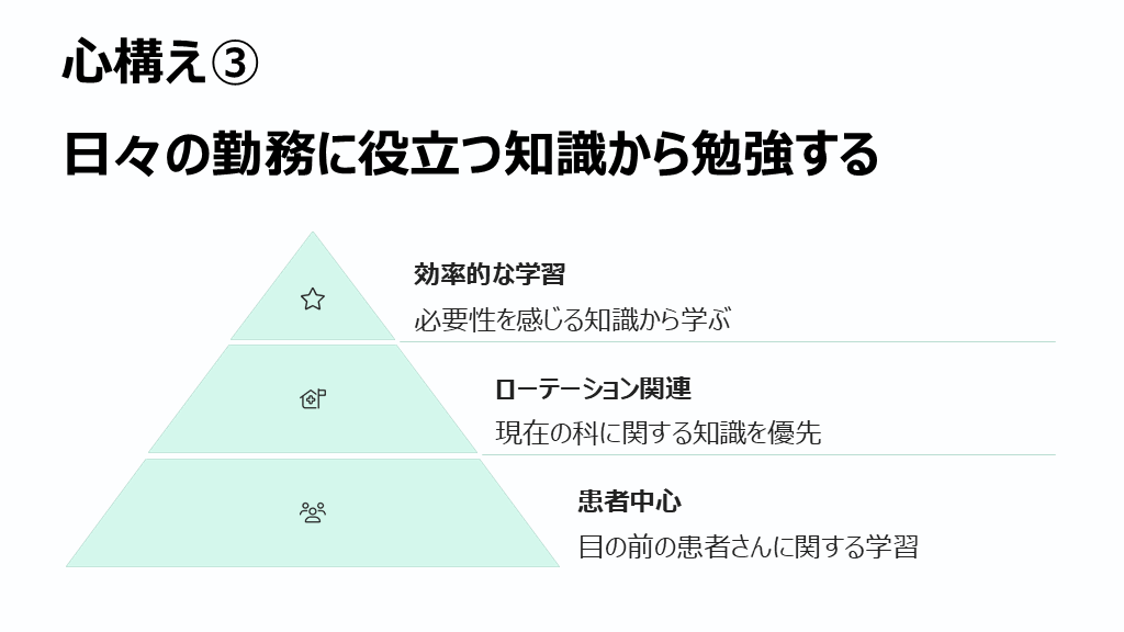 日々の勤務に役立つ知識から勉強する 効率的な学習 必要性を感じる知識から学ぶ ローテーション関連 現在の科に関する知識を優先 患者中心 目の前の患者さんに関する学習