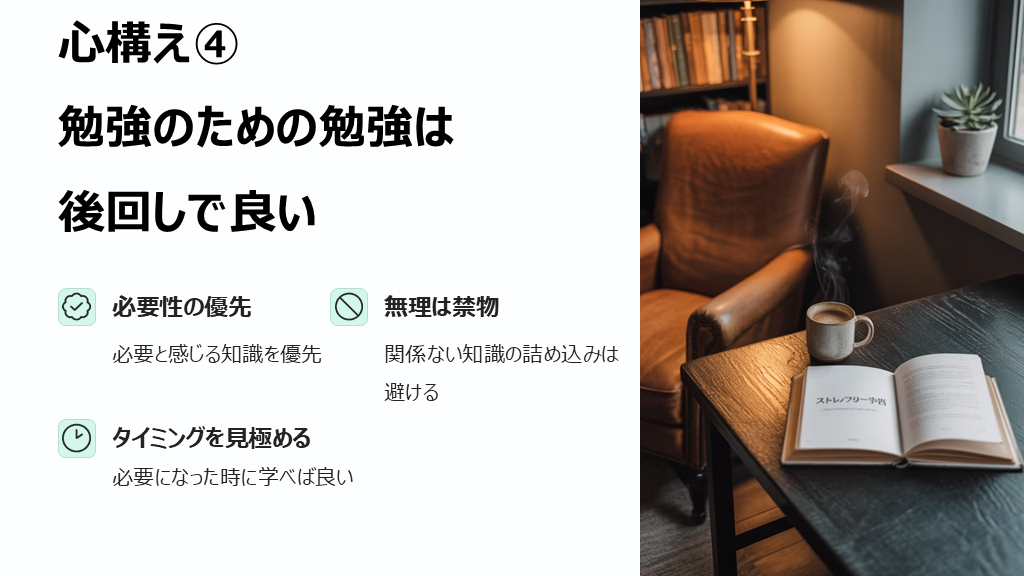 後回しで良い 必要性の優先 必要と感じる知識を優先 無理は禁物 関係ない知識の詰め込みは避ける タイミングを見極める 必要になった時に学べば良い
