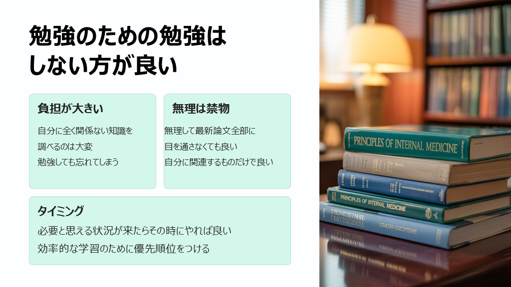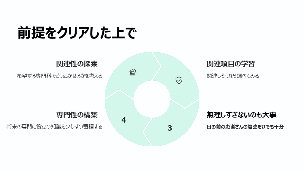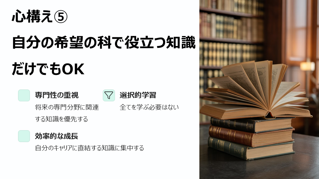 自分の希望の科で役立つ知識だけでもOK 専門性の重視 将来の専門分野に関連する知識を優先する 選択的学習 全てを学ぶ必要はない 効率的な成長 自分のキャリアに直結する知識に集中する