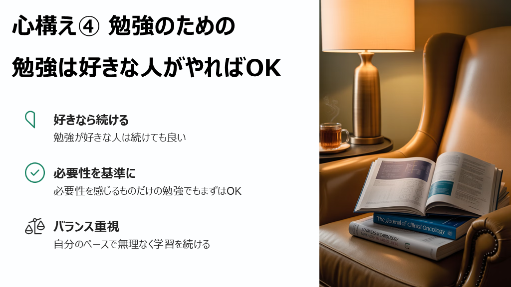 勉強は好きな人がやればOK 好きなら続ける 勉強が好きな人は続けても良い 必要性を基準に 必要性を感じるものだけの勉強でもまずはOK バランス重視 自分のペースで無理なく学習を続ける
