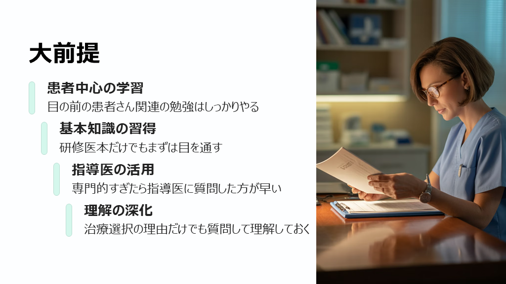一般的知識だけでも研修医本で調べてみましょう。 患者さんから学ぶ コスパも良いし、患者さんのためになります。 勉強すること自体を目的にしない 目の前の患者さん、自分の将来に役立つものから優先的に学びましょう。