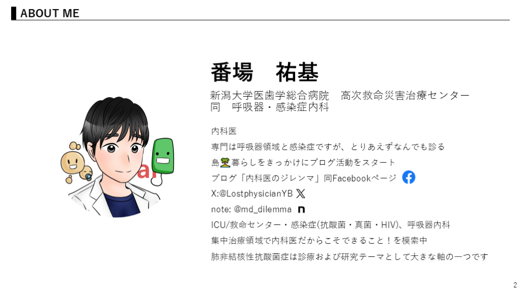 #2. 2 ABOUT ME Goal 番場 祐基 新潟大学医歯学総合病院 高次救命災害治療センター同 呼吸器・感染症内科 内科医