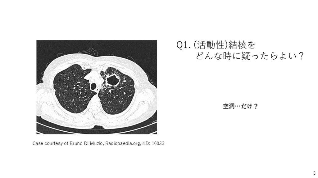 #3. 3 Case courtesy of Bruno Di Muzio, Radiopaedia.org, rID: 16033 Q1. (活動性)結核を どんな時に疑ったらよい? 空洞…だけ?