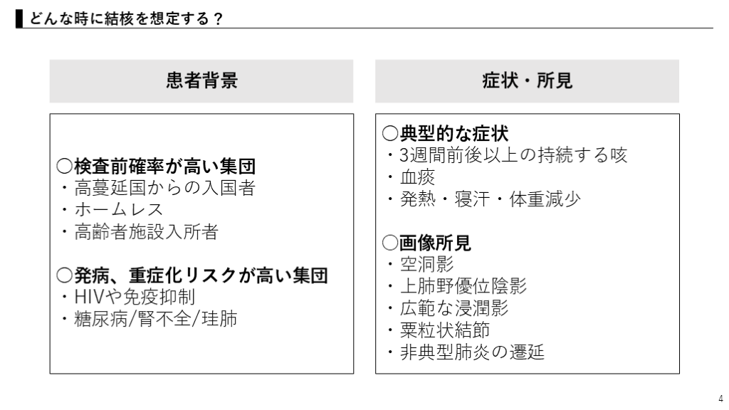 #4. 4 どんな時に結核を想定する? ○検査前確率が高い集団・高蔓延国からの入国者