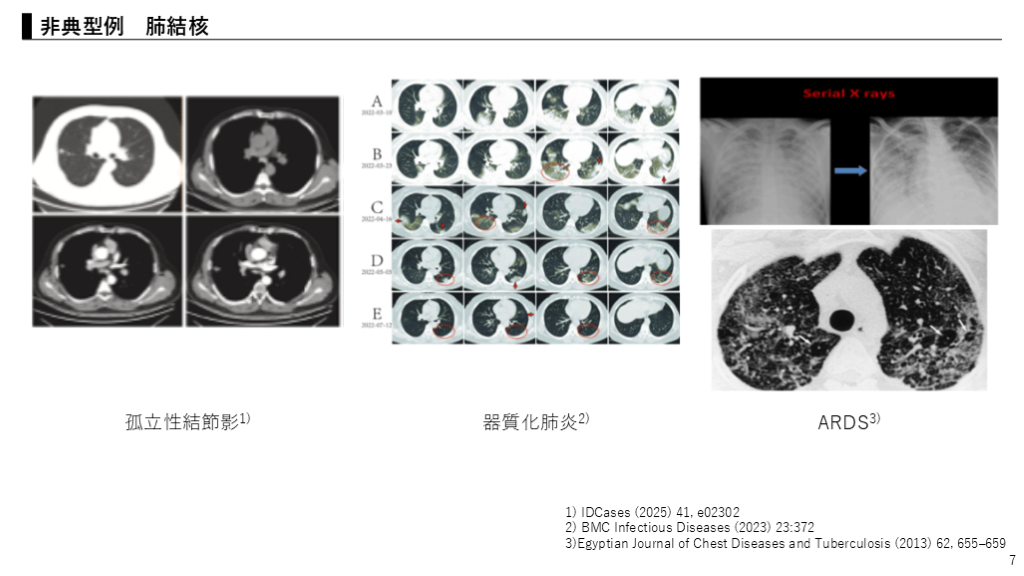 #7. 7 非典型例 肺結核 孤立性結節影1) 器質化肺炎2) ARDS3) 1) IDCases (2025) 41, e02302